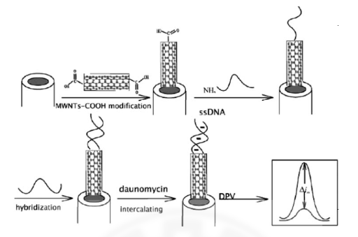 شکل 9. طرحواره آشکارسازی الکتروشیمیایی هیبریداسیون DNA با استفاده از حسگر زیستی بر پایه نانولوله های کربنی چند دیواره